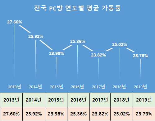 통계자료에 의하면 전국 PC방 2019년 연평균 가동률이 역대 최저치 23.76%를 기록했다고 합니다.