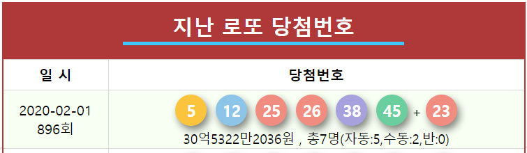 로또896회당첨번호 분석 5 12 25 26 38 45 + 23, 1등 7명 각 30억씩 본문