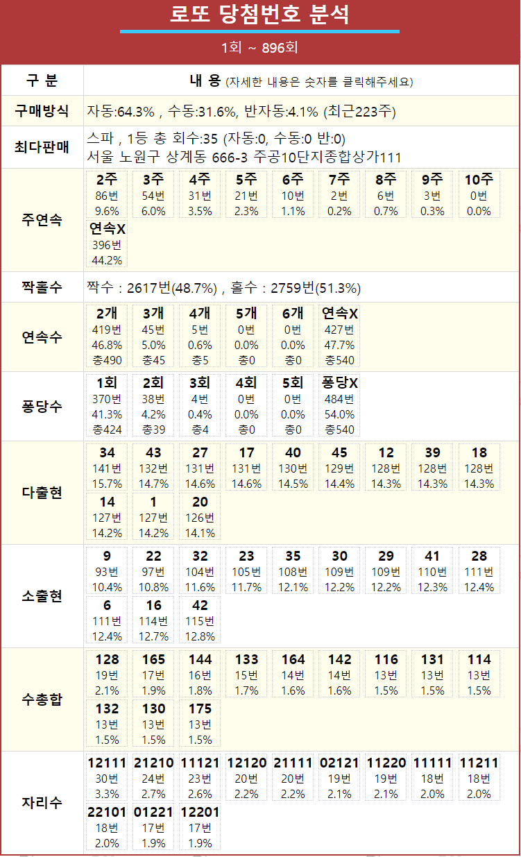 1~896회 역대 로또 당첨번호 분석