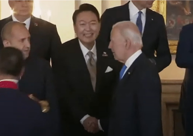 그리고 스페인 국왕 주최 만찬에서 바이든 대통령은 윤석열 대통령에게 악수를 청했다.